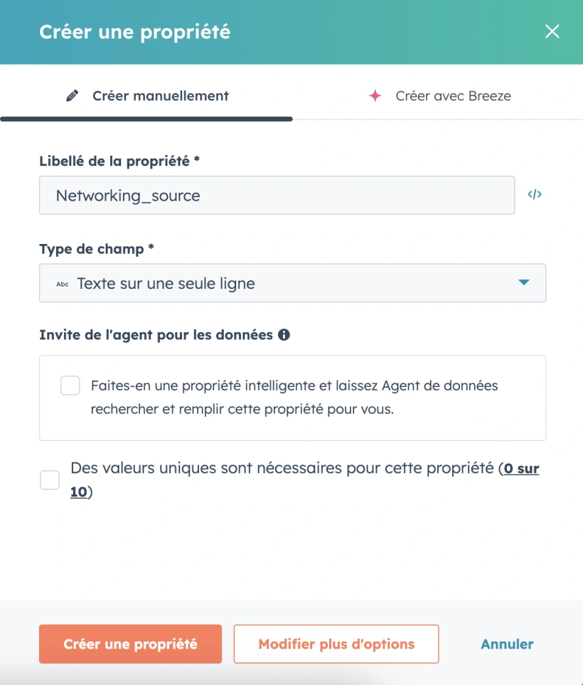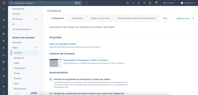 Pour faciliter le suivi, la segmentation et l’automatisation de vos prospects, WEMET peut automatiquement renseigner une propriété HubSpot dédiée lors de l’envoi d’un lead dans votre CRM.